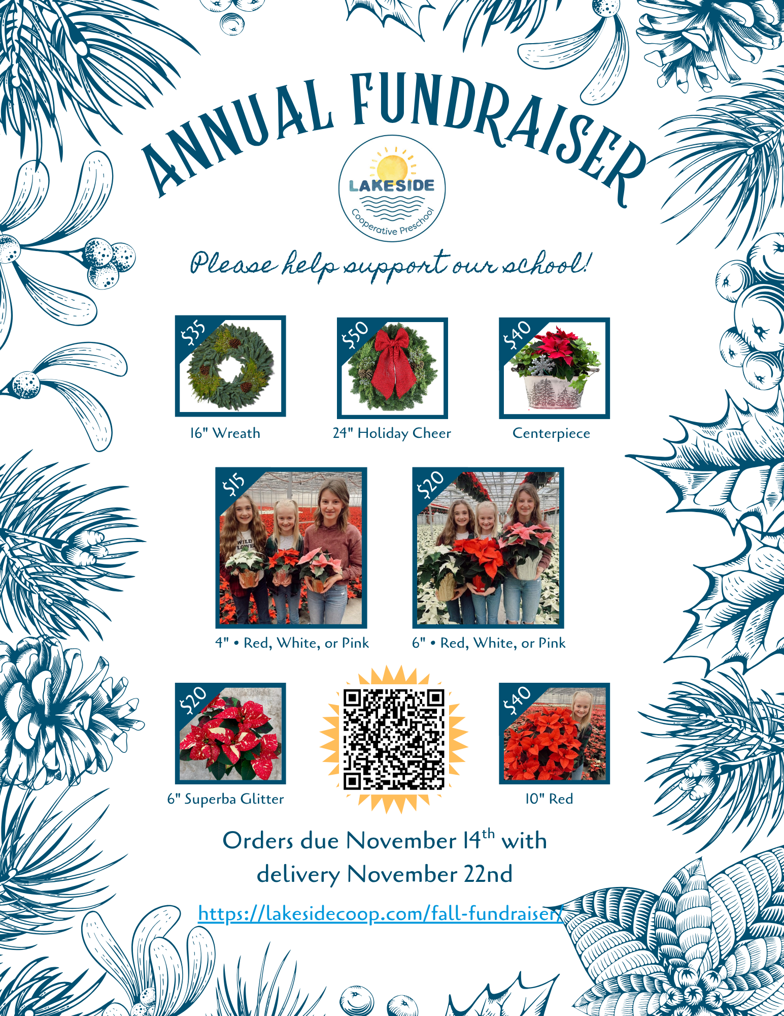 Thank you for supporting Lakeside Cooperative Preschool’s Fall Fundraiser! Fundraising and donations allow our preschool to maintain our high quality programs and teachers while keeping tuition rates affordable for our families.