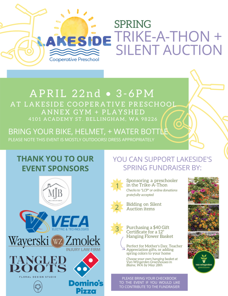 Our largest fundraising event of the year is our annual Trike-A-Thon and Auction. Our Trike-A-Thon is a fun family and friends event that includes students riding laps on trikes or bikes, family friendly activities and entertainment, and a silent auction. Silent auction items are donated from preschool families and local businesses. Our next Spring Family Event and Fundraiser will be May 2nd, 2026.